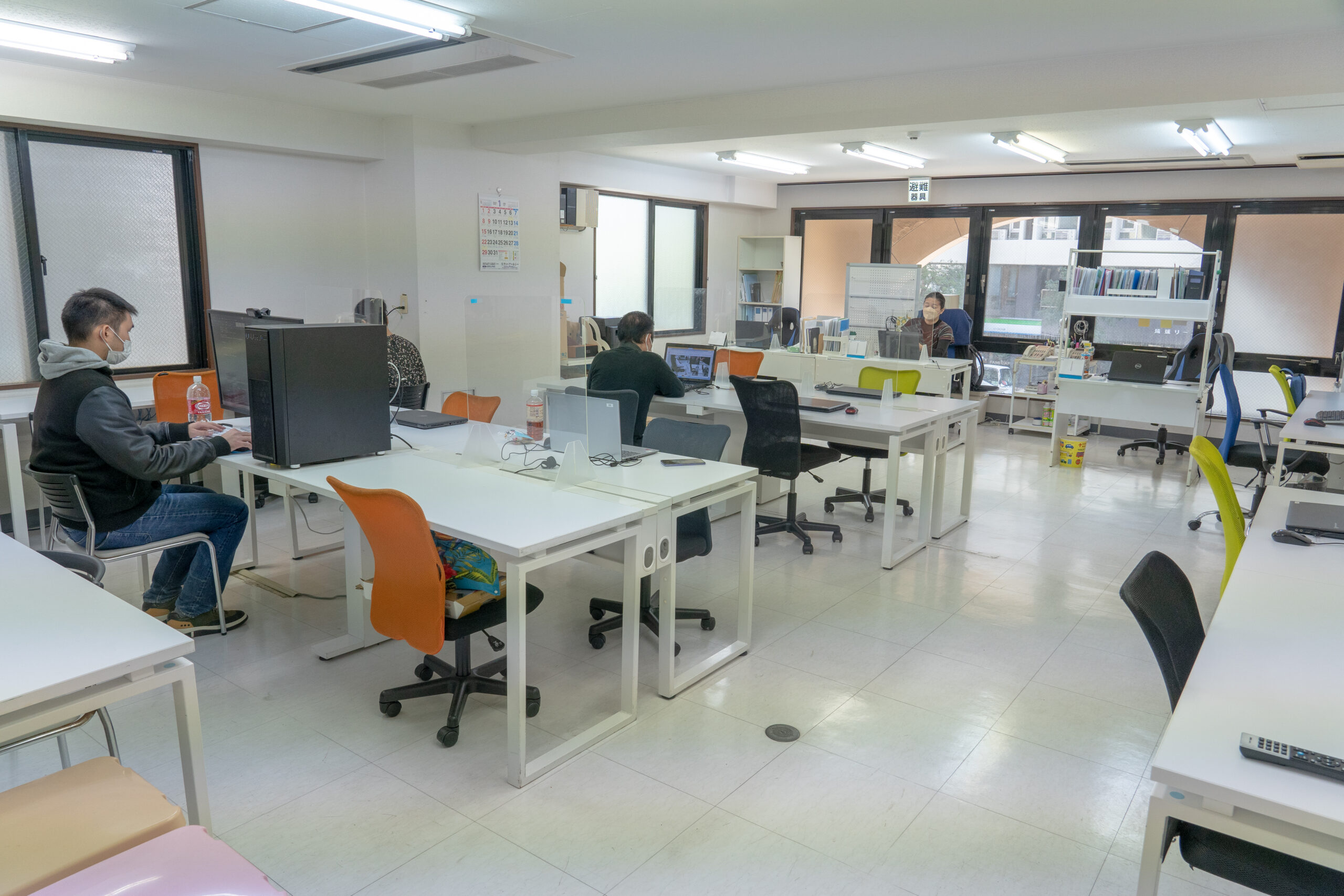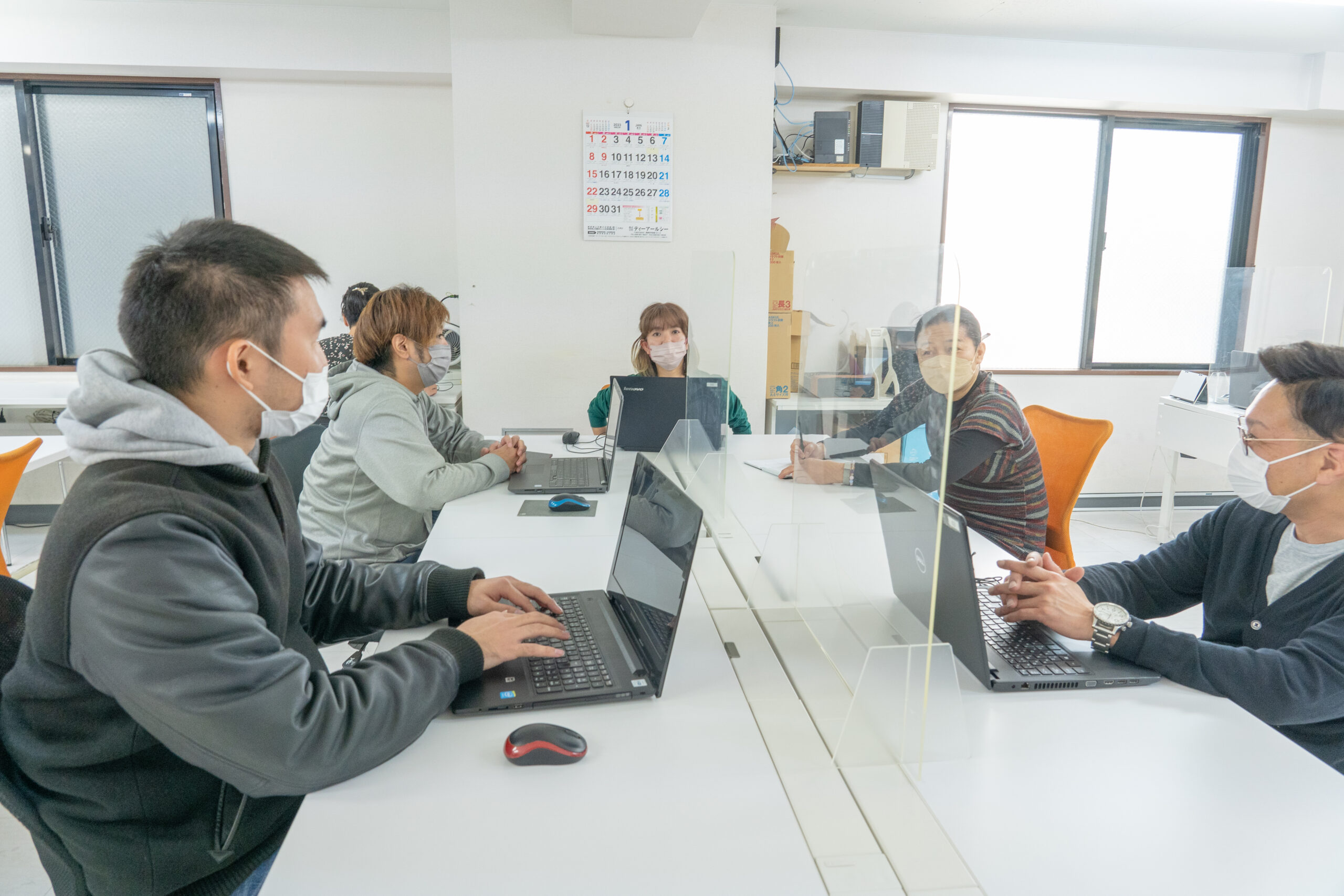 | 設備 | ・ひとり1台のパソコン(通所者に限る) ・ロッカー完備 ・給湯器あり ・男女共用トイレ ・在宅勤務相談可 |